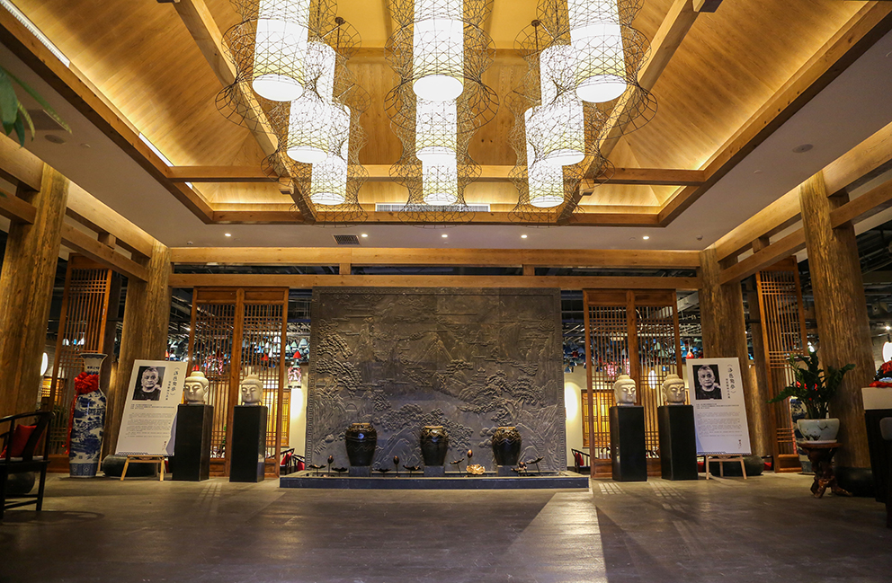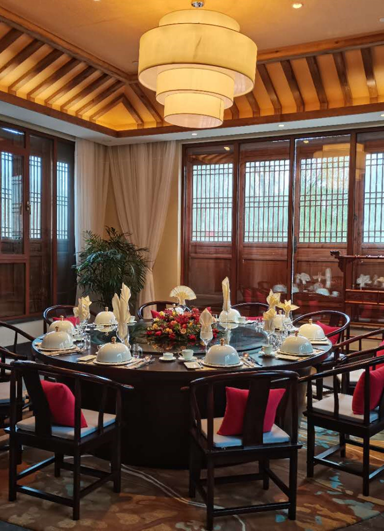 環(huán)境顯品位。酒店外觀飛檐斗拱,蔚為大觀;內(nèi)部裝飾以漢唐主流色彩為主,既古樸厚重又靈動時尚。名人書畫、石雕擺件點綴其中,盡顯文化韻味。酒店東鄰新街路,西臨新潭湖,南接文峰塔,北瞰非遺區(qū),是園區(qū)內(nèi)地標性建筑。登樓四望,但見古建林立,人流如梭,小橋流水,相映成趣,可謂洛陽市不可多得的就餐觀景***之地。