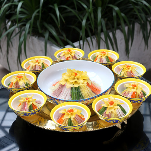 水席園旗艦店由一個(gè)可同時(shí)接待近400人就餐的大型宴會廳、一個(gè)可接納100人就餐的小型宴會廳和31個(gè)風(fēng)格各異的雅間組成,它既保留了水席園水席用湯講究、配頭精致的精髓,同時(shí)在突出水席園風(fēng)味特色的同時(shí),還推出粵、湘、川及私房菜等深受大眾喜愛的各色菜品,以及全聚德烤鴨、紅子雞、黃河大鯉魚等洛陽餐旅集團(tuán)的幾十道貫標(biāo)菜,真正做到走進(jìn)一店,吃遍天下。