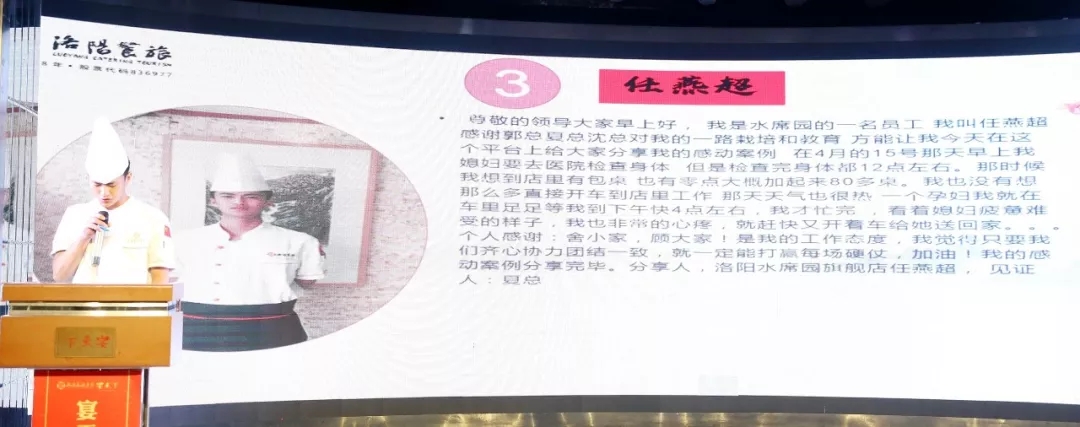 5月22日上午,宴天下新區(qū)店熱鬧非凡,洛陽(yáng)餐旅實(shí)業(yè)第20期“一情二用心”活動(dòng)總結(jié)表彰大會(huì)在這里舉行。公司行政總廚盧躍青、副總經(jīng)理閆利輝等管理人員出席大會(huì),各子公司總經(jīng)理和員工代表200余人參加表彰活動(dòng)。