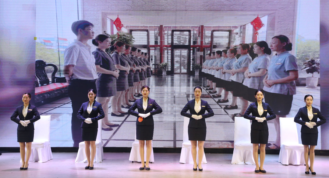 參賽者以飽滿的熱情,全力參賽。上午進(jìn)行了前廳管理形象禮儀、T臺(tái)形象、安保團(tuán)隊(duì)展示,來(lái)自各店的參賽者身著職業(yè)裝,自信登場(chǎng),展現(xiàn)職業(yè)技能,體現(xiàn)日常工作的點(diǎn)滴。