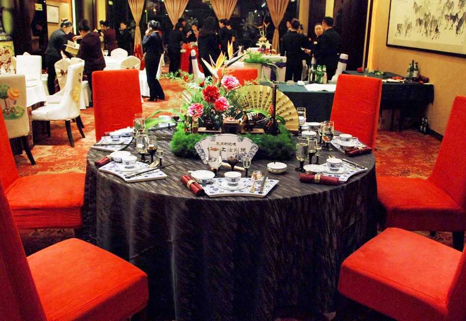 湘鄂匯大酒店的餐臺設(shè)計名為“步步高”,***商務(wù)宴色彩。印有牡丹花紋的臺布及餐具寓意洛陽餐飲旅游集團公司的發(fā)源地是在洛陽,牡丹花也是國花,預(yù)示著集團公司要做洛陽***、河南***、中國知名的餐飲品牌。雙色口布折花與餐桌、靠椅顏色交相呼應(yīng),選色簡潔大方。主題設(shè)計采用三層,分別為插花藝術(shù)、主題意義及雕刻藝術(shù)。底層由鮮花托起的集團標(biāo)識尤為醒目。